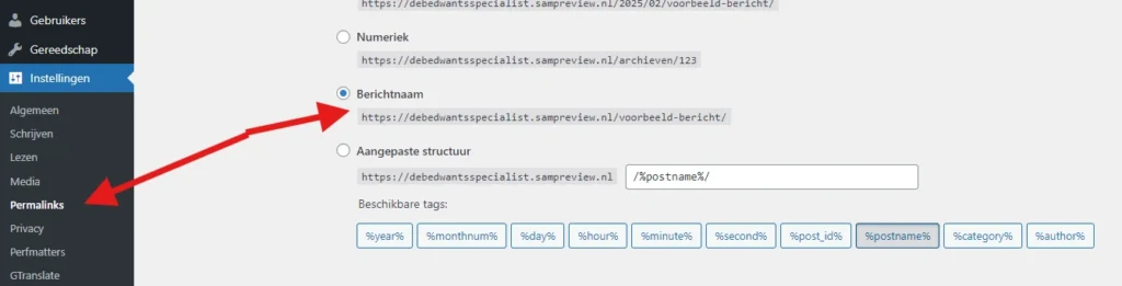 - Permalinks aanpassen: ga naar instellingen > permalinks en kies “berichtnaam” voor SEO vriendelijke URL’s.